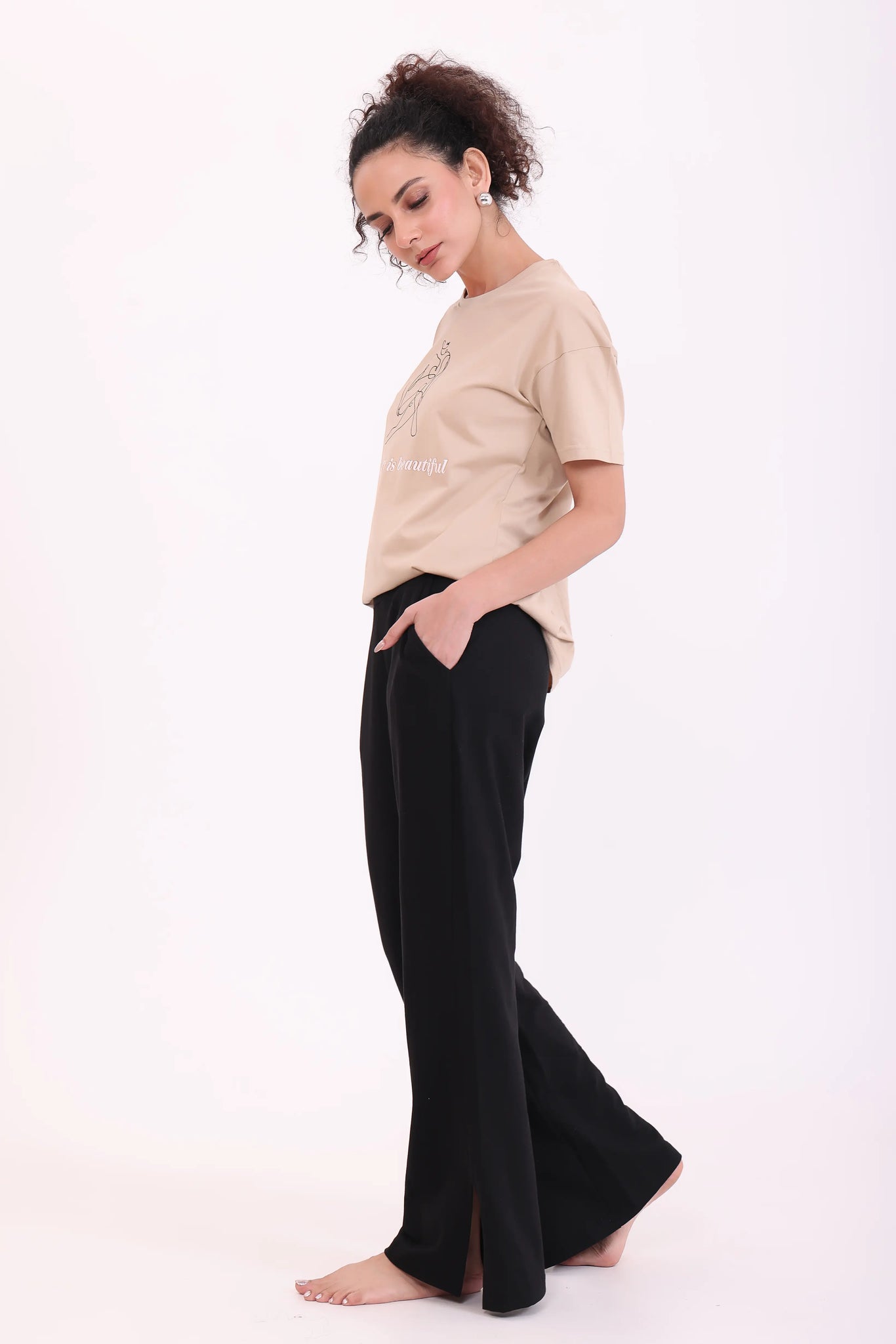 Step out in style with our Flared Side Slit Pants – a blend of chic design and everyday comfort. Featuring a flattering flared silhouette with stylish side cut detailing, an easy elasticated waistband with drawstring, and handy side pockets, these pants bring both statement and function into your wardrobe.